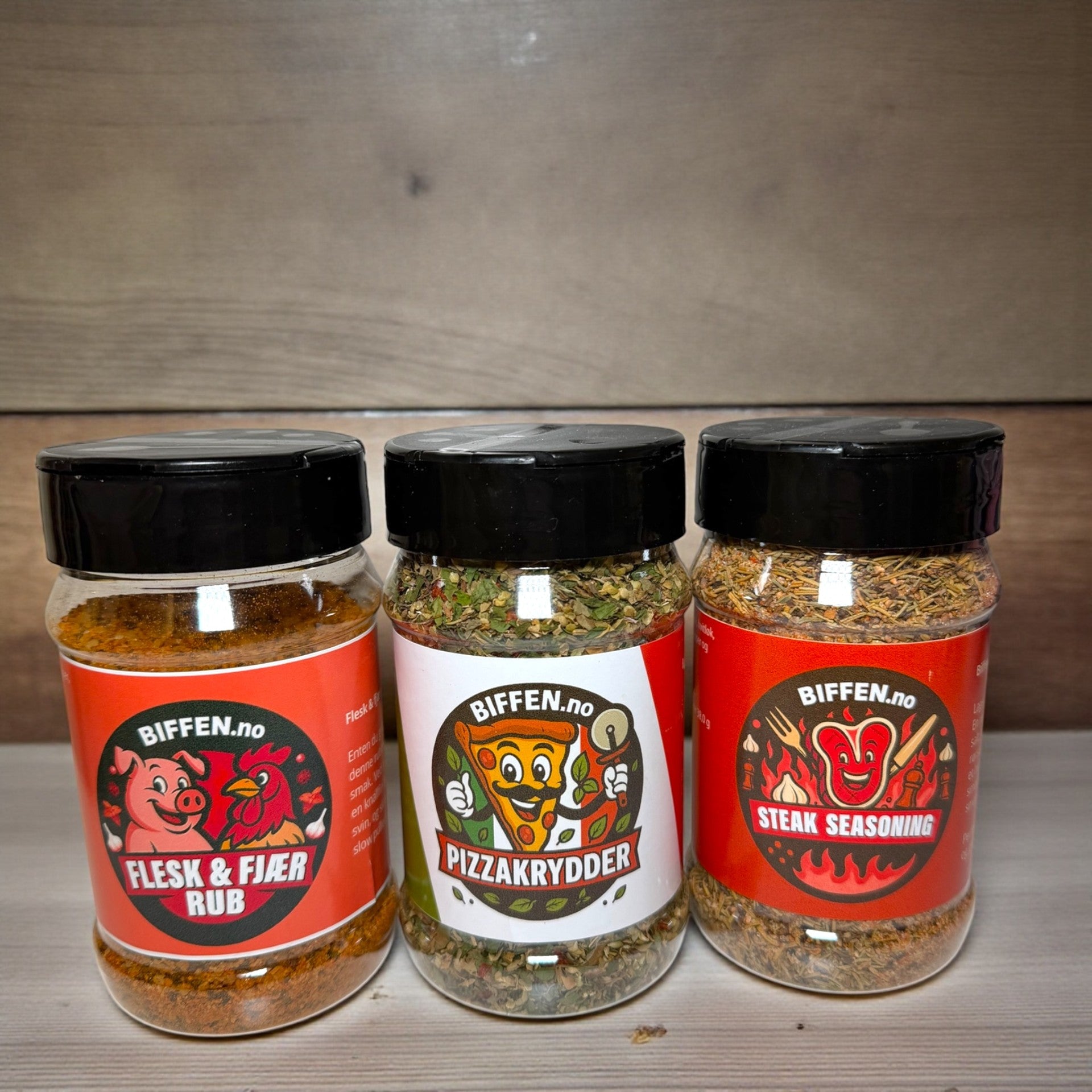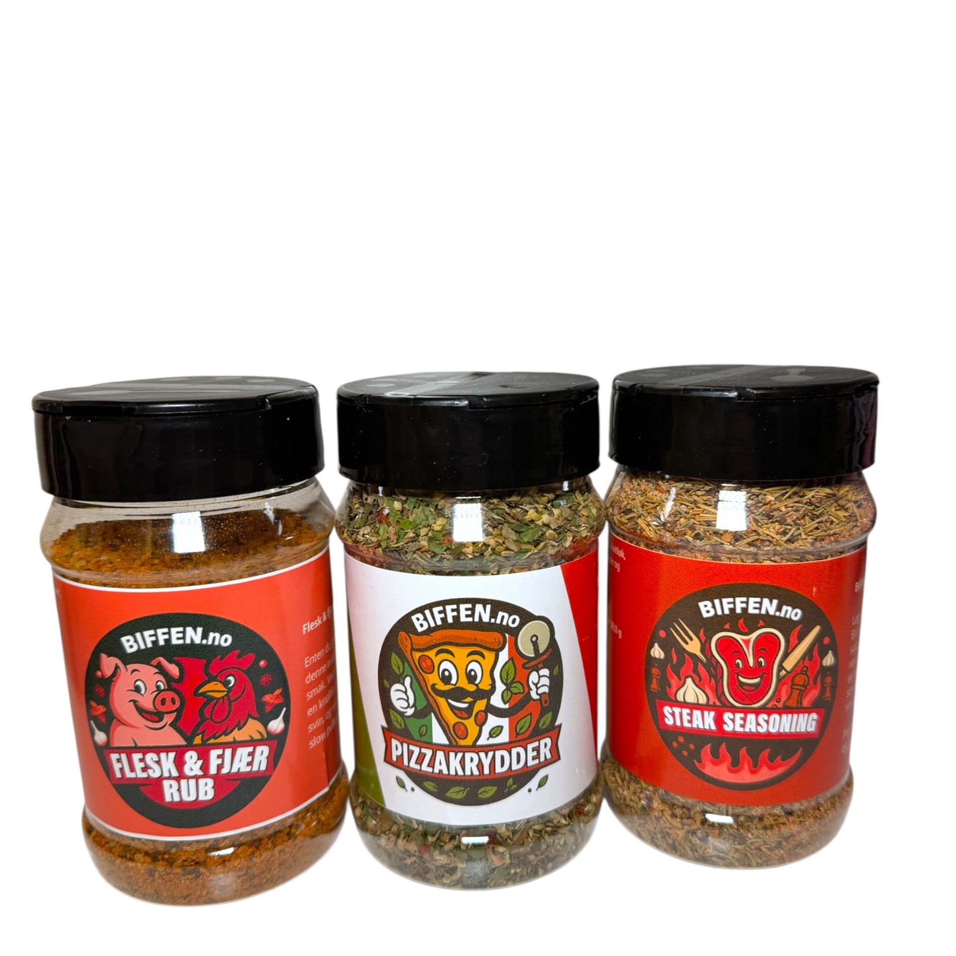 🔥 Komplett pakke: Inneholder Flesk & Fjær, Pizzakrydder og Steak Seasoning.